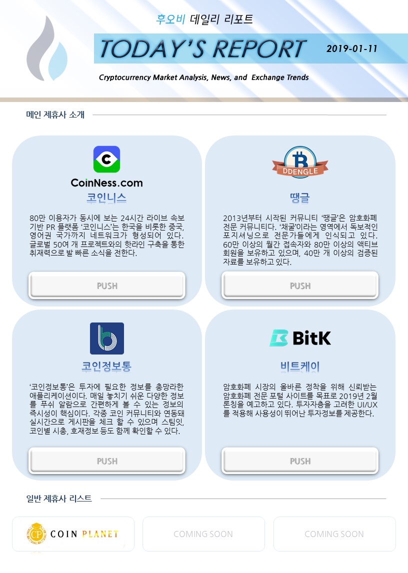 땡글은 후오비 전용관을 오픈해 서비스 제공을 시작했고, 애플리케이션 기반의 코인정보통 역시 콘텐츠 배포 및 알림 서비스를 진행하고 있다.