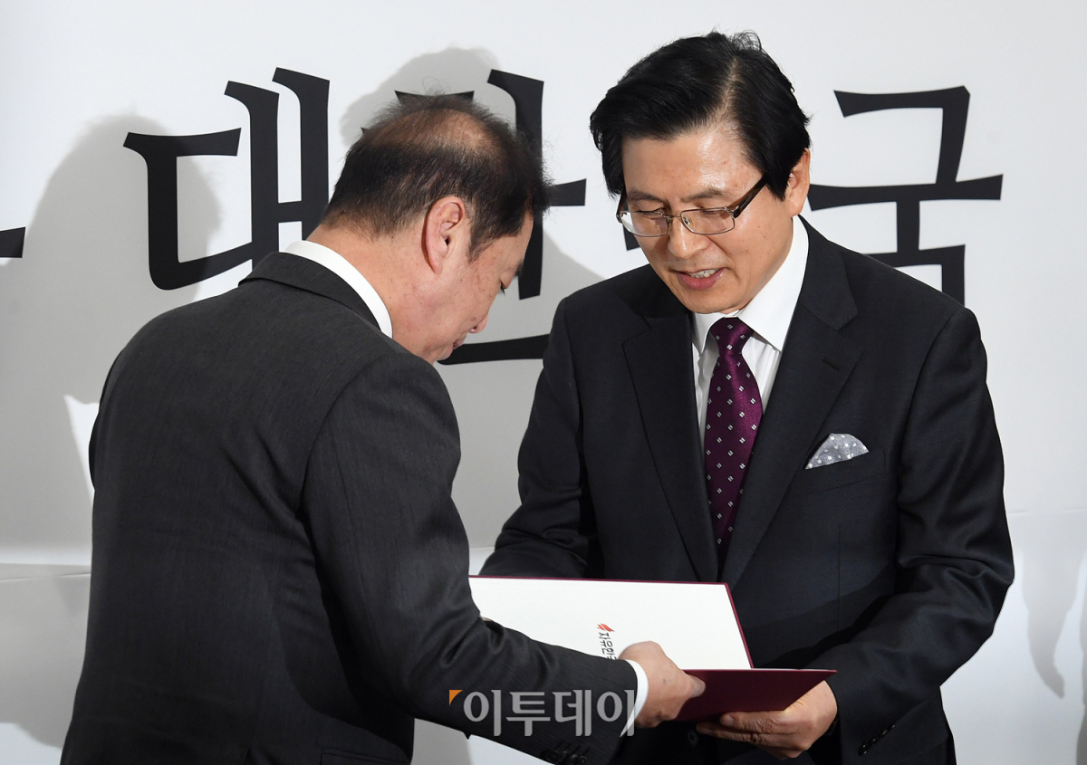 황교안(오른쪽) 전 국무총리가 자유한국당에 입당했다. 황 전 총리가 15일 오전 서울 여의도 국회에서 김병준 자유한국당 비상대책위원장에게 입당원서를 제출하고 있다. 오승현 기자 story@