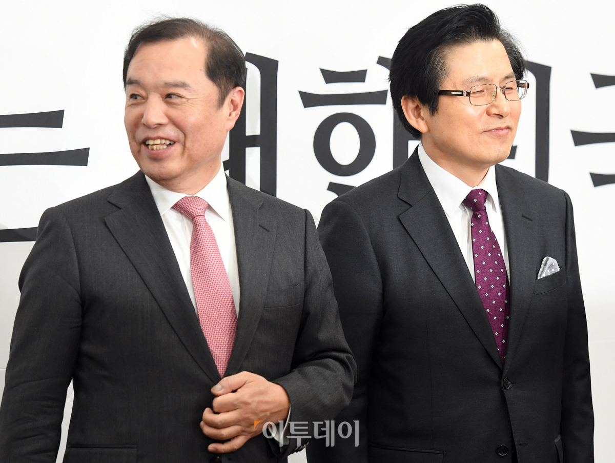 황교안(오른쪽) 전 국무총리가 자유한국당에 입당했다. 황 전 총리가 15일 오전 서울 여의도 국회에서 김병준 자유한국당 비상대책위원장에게 입당원서를 제출한 후 기념촬영 하고 있다. 오승현 기자 story@