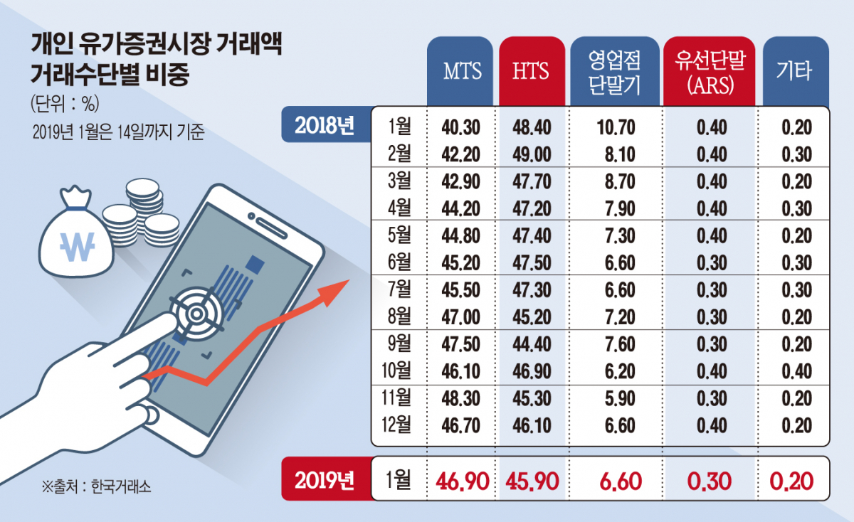 올해 1월에도 MTS 거래액 비중은 46.9%로 HTS(45.9%)를 앞섰다. 개인의 MTS 거래가 늘면서 개인·외국인·기관 등 전체 투자자의 코스피 주식거래에서 MTS가 차지한 비중도 지난해 22.9%로 HTS(24.7%)를 바싹 추격했다.