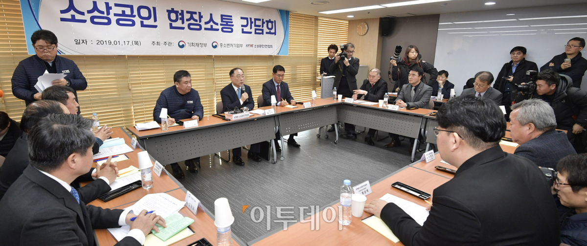 홍남기 경제부총리 겸 기획재정부장관이 17일 오전 서울 동작구 소상공인연합회를 방문해 '소통 라운드테이블' 형식으로 업종별 소상공인 대표들과 의견을 나누고 있다. 이날 홍 부총리는 서울시의 제로페이의 부진한 성과와 최저임금 정책 관련 등 소상공인들의 애로사항을 청취했다. 오승현 기자 story@