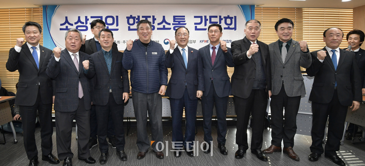 홍남기 경제부총리 겸 기획재정부장관이 17일 오전 서울 동작구 소상공인연합회를 방문해 최승재 소상공인연합회장 등 업종별 소상공인 대표들과 기념촬영을 하고 있다. 이날 홍 부총리는 '소통 라운드테이블' 형식으로 소상공인들과 의견을 나눴다. 오승현 기자 story@