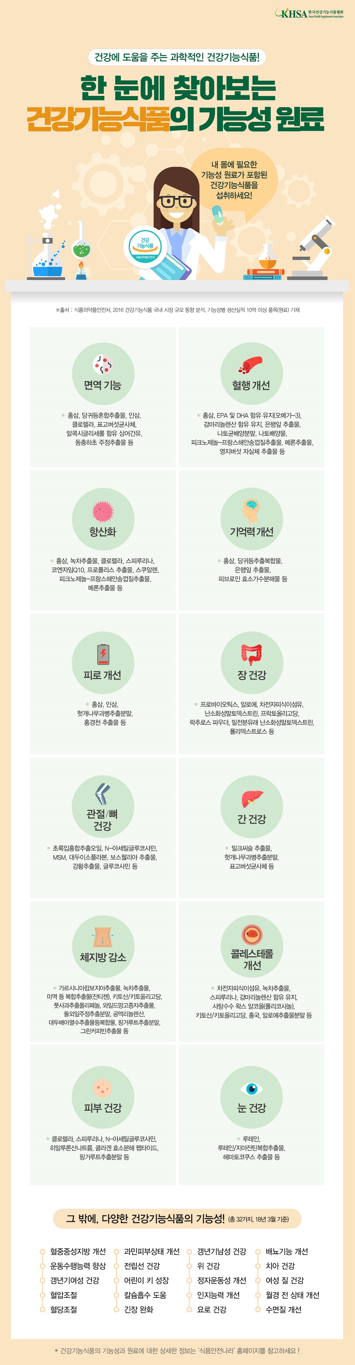 면역 증진・혈행 개선・항산화・기억력 개선・피로 개선・장 건강・눈 건강 등 현재까지 식약처로부터 인정받은 건강기능식품의 기능성은 30여 가지에 이른다.