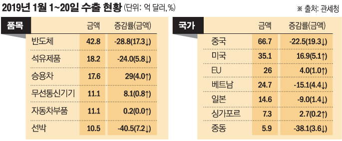 최배근 건국대 경제학과 교수는 “D램 같은 경우는 작년에도 2~3년 전과 비교해 물량은 크게 변화가 없는데, 가격 거품으로 수출액만 늘어났던 것이었다”며 “현재는 가격이 하락한 데 더해 물량까지 줄면서 수출액 감소 폭이 더 커진 상황”이라고 진단했다. 그는 “반도체의 특수성을 배제하더라도 국제유가 하락, 미국의 경기 침체 등을 고려하면 올해 수출은 마이너스 성장을 기록할 가능성이 크다”고 전망했다.