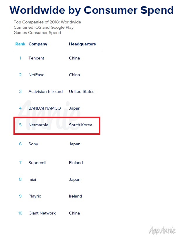 모바일 앱 마켓 분석사이트 앱애니가 발표한 자료에 따르면 넷마블은 지난해 텐센트, 넷이즈, 액티비전 블리자드, 반다이 남코에 이어 글로벌 모바일 게임 매출 5위를 기록한 것으로 나타났다.