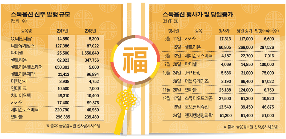 한편 넷마블, 더블유게임즈, 카카오, 스튜디오드래곤 등 IT 업종도 약진했다. 2017년 6개사에 불과했던 IT 관련 기업은 10곳으로 늘었다. 넷마블은 지난해 11차례에 걸쳐 23만9480주가 행사됐다. 당일 기준 종가와 비교하면 약 392%의 수익을 거둔 것으로 보인다.