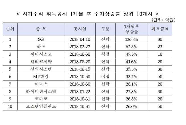 자기주식 취득공시 10일 후 초과수익률은 2.73%포인트, 1개월 후 초과수익률은 1.88%포인트였다.