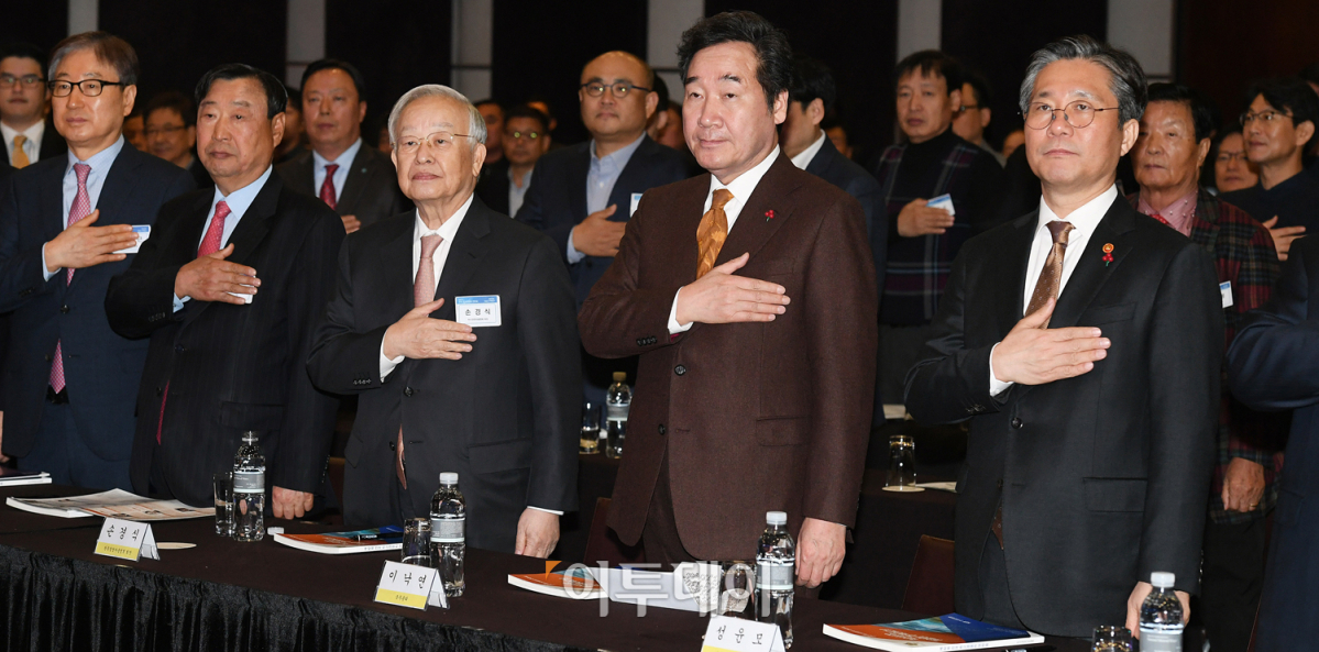 이낙연 국무총리와 성윤모(오른쪽) 산업통상자원부 장관, 손경식 한국경영자총협회 회장을 비롯한 참석자들이 24일 오전 서울 중구 웨스틴조선호텔에서 개막한 '제42회 전국 최고경영자 연찬회' 개막식에서 국민의례를 하고 있다. 왼쪽은 손경식 한국경영자총협회 회장, 오른쪽은 성윤모 산업통상자원부 장관. '혁신성장, 기업이 주역이다!'를 대주제로 25일까지 이틀간 열리는 이번 행사는 다양한 분야의 연사들이 현 경제상황을 진단하고, 기업의 혁신성장 방향을 모색한다. 오승현 기자 story@