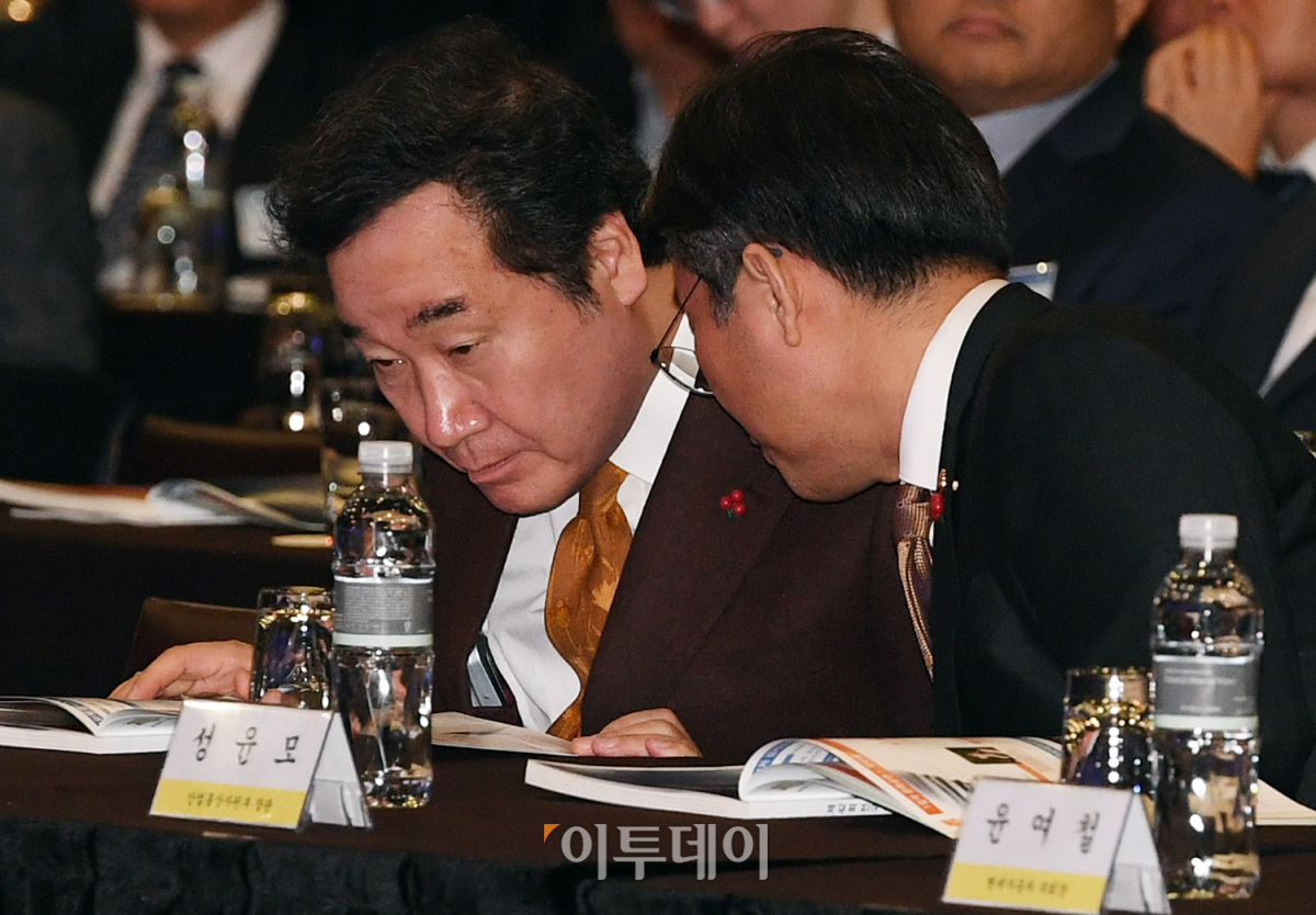 이낙연 국무총리가 24일 오전 서울 중구 웨스틴조선호텔에서 개막한 '제42회 전국 최고경영자 연찬회' 개막식에서 성윤모 산업통상자원부 장관과 대화를 나누고 있다. '혁신성장, 기업이 주역이다!'를 대주제로 25일까지 이틀간 열리는 이번 행사는 다양한 분야의 연사들이 현 경제상황을 진단하고, 기업의 혁신성장 방향을 모색한다. 오승현 기자 story@
