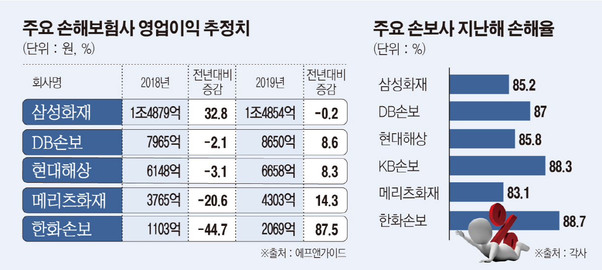 현대해상(6148억 원, 전년 대비 3.1% 감소)과 DB손해보험(7965억 원, 2.1% 감소) 역시 사정은 비슷하다. 다만 삼성화재는 재작년 경쟁사보다 높았던 손해율 기저효과로 인해 32.8% 늘어난 1조4879억 원을 기록할 것으로 보인다.