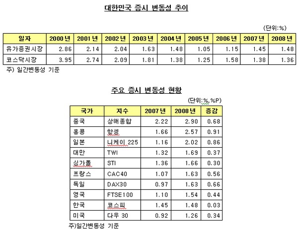 우리 증시의 변동성(1.48%)은 미국(1.26%)보다 높은 편이나, 일본(2.02%), 독일(1.63%), 영국(1.54%) 등 주요 선진국 증시보다 낮았으며 주요 증시중 중국(2.90%)과 홍콩(2.57%)의 변동성이 가장 높았다.