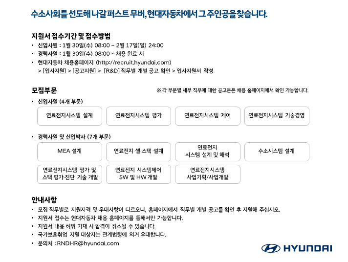 이어 경력사원 7개(△MEA 설계 △연료전지 셀ㆍ스택 설계 △연료전지 시스템 설계 및 해석 △수소시스템 설계 △연료전지시스템 평가 및 스택 평가ㆍ진단기술 개발 △연료전지 시스템 제어 SW 및 HW 개발 △연료전지시스템 사업기획/사업개발)분야도 채용한다.