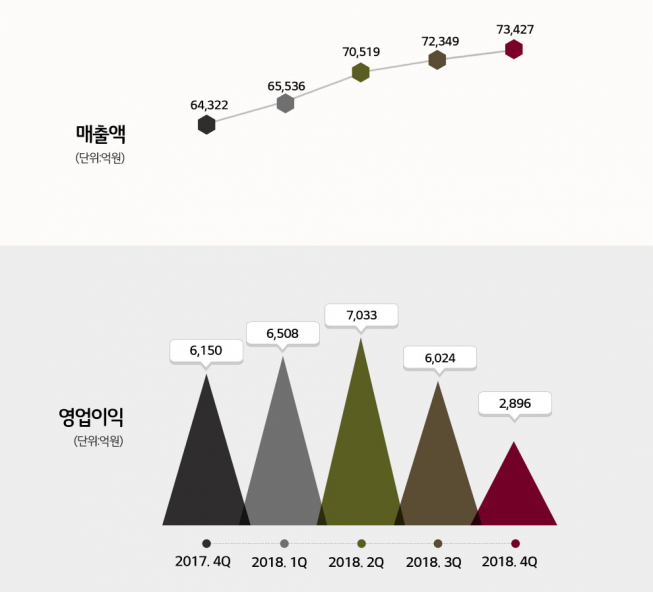 지난 4분기 실적 역시 매출액은 7조 3427억 원으로 전년 동기 대비 14.2% 증가하며 사상 최대를 달성했다. 그러나 같은 기간 영업이익과 순이익은 2896억 원, 1266억 원으로 각각 52.9%, 62.6% 감소하며 반토막난 성적표를 받았다.