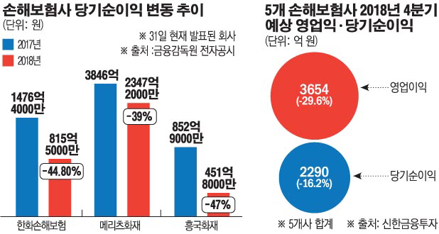 한화손보의 지난해 순이익은 816억 원으로 2017년 1476억 원보다 약 45% 감소했다. 같은 기간 메리츠화재는 2347억 원으로 2017년 순이익 3846억 원보다 39% 줄어들었다. 흥국화재 역시 2017년 순이익 853억 원에서 지난해 452억 원으로 47% 감소한 것으로 집계됐다.