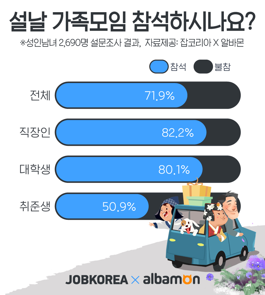 잡코리아와 알바몬의 공동 조사 결과, 설문에 참여한 응답자의 71.9%가 ‘올해 설날 가족ㆍ친지모임에 참석할 것’이라 답했다.