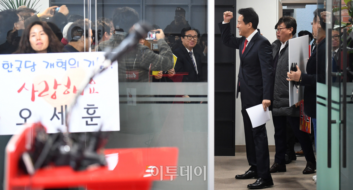 오세훈 전 서울시장이 7일 오전 당 대표 선거 출마를 선언하기 위해 서울 영등포구 자유한국당 중앙당사에 들어서고 있다. 오승현 기자 story@