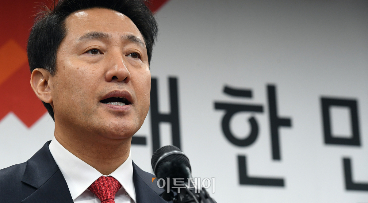 오세훈 전 서울시장이 7일 오전 서울 영등포구 자유한국당 중앙당사에서 당 대표 선거 출마를 선언하고 있다. 오승현 기자 story@