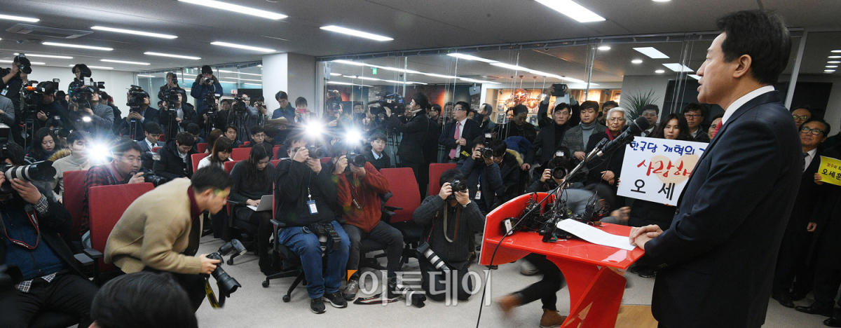 오세훈 전 서울시장이 7일 오전 서울 영등포구 자유한국당 중앙당사에서 당 대표 선거 출마를 선언하고 있다. 오승현 기자 story@