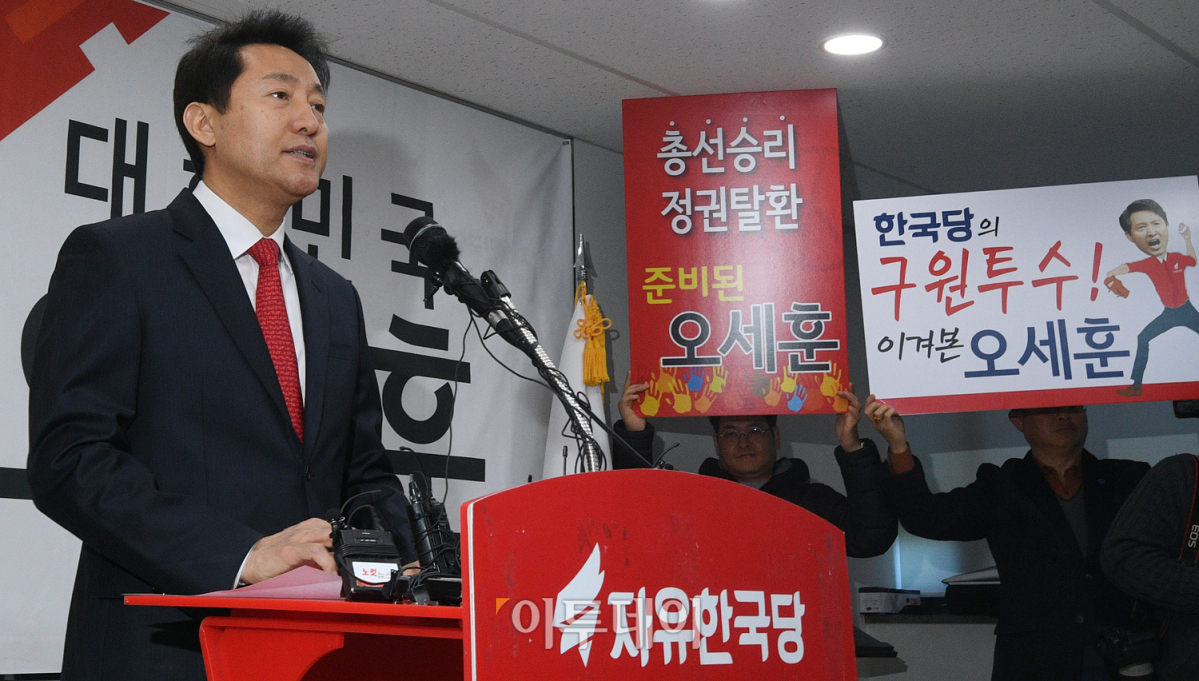 오세훈 전 서울시장이 7일 오전 서울 영등포구 자유한국당 중앙당사에서 당 대표 선거 출마를 선언하고 있다. 오승현 기자 story@
