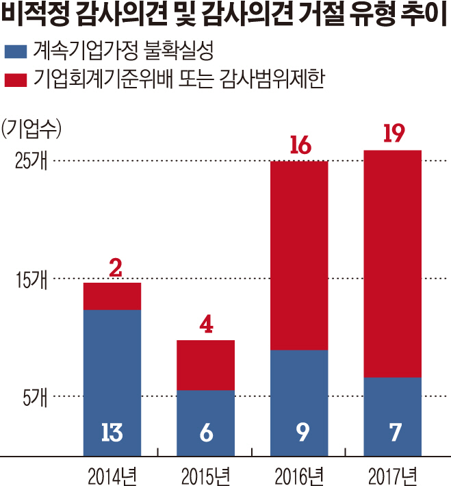 7일 KB증권에 따르면 외부감사인으로부터 ‘한정’이나 ‘의견거절’ 등 비적정 감사의견을 받은 상장사들이 2014년(12월 결산 기준) 15개사에서 2016년 25곳, 2017년 26군데로 약 73% 증가했다.