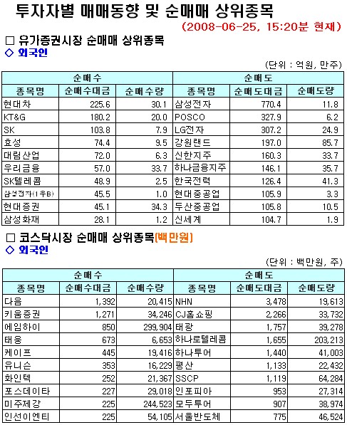코스닥시장에서는 NHN(34억원)과 함께 하나투어(14억원), 모두투어(9억원) 등의 여행관련주, 태광(17억원), CJ홈쇼핑(22억원), 하나로텔레콤(16억원)을 순매도하고 다음(13억원), 키움증권(12억원), 에임하이(8억원), 태웅(6억원), 케이프(4억원), 유니슨(3억원)을 순매수했다.