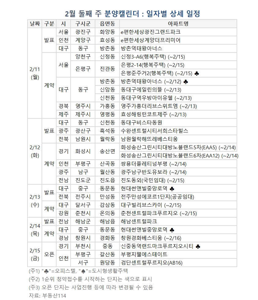 이밖에 인천 계양구 효성동 ‘e편한세상계양더프리미어’ 등 9개 단지가 당첨자를 발표한다. 대구 달서구 감삼동 ‘대구빌리브스카이’, 광주 남구 월산동 ‘광주남구반도유보라’ 등 17개 단지에서 계약이 이뤄진다.