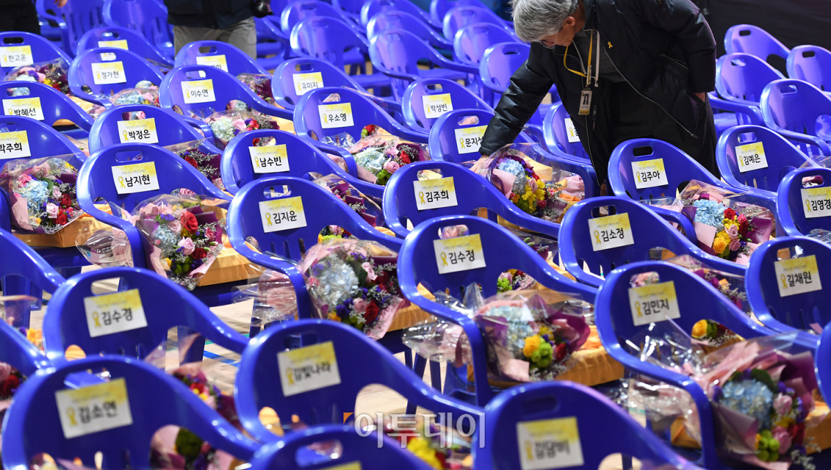 '세월호 참사'로 희생된 단원고등학교 학생들의 '명예 졸업식'이 열린 12일 오전 경기 안산시 단원고에서 희생자들의 자리에 학생증과 꽃다발 등이 놓여 있다. 졸업식에는 유가족을 비롯해 유은혜 사회부총리 겸 교육부장관, 이재정 경기도교육감 등이 참석했다. 오승현 기자 story@