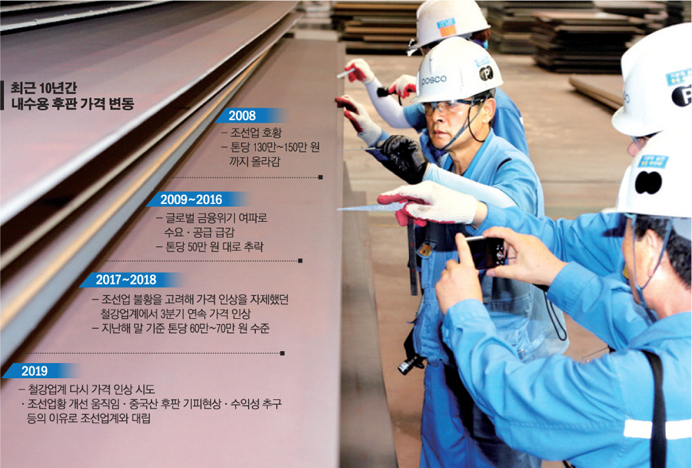 업황에 상관없이 조선사의 요구가 후판가에 반영된 결과다.당시 현대중공업, 대우조선해양, 삼성중공업 등 국내 빅3의 수주 성적은 글로벌 최고였지만, 저가 수주에 따른 수익성 차원에서 후판가 인하를 읍소할 수밖에 없는 상황이었다. 철강업계는 이를 받아들였고, 심지어 한 철강업체는 ‘수출 전면 중단’을 선언하고 국내 조선사 대상으로 내수 우선 공급 방침을 정할 정도였다. 당시 수입산 후판가가 톤당 200만 원에 달했다면 우리 판매가는 130만~150만 원 선이었다.