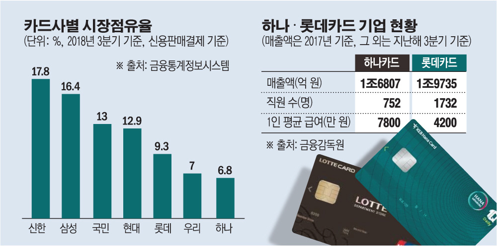 지난달 30일 진행된 롯데카드 매각 예비입찰에 10여 곳이 참여한 가운데 하나금융과 한화그룹 등 2곳만 주요 전략적투자자(SI)로 응찰했다. 카드 업황 악화, 높은 매각가 등 위험이 크지만 하나카드가 업계 중상위권으로 도약하기 위해선 롯데카드가 꼭 필요한 파트너다. 지난해 3분기 기준 신용판매(개인·법인·체크카드) 시장점유율은 롯데카드 9.3%, 하나카드 6.8%다. 이를 합치면 16.1%로 업계 2위인 삼성카드와 경쟁할 수 있게 된다.