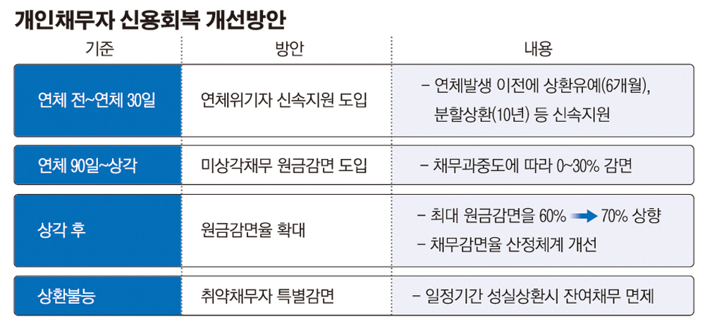 아울러 ‘연체위기자 신속지원 제도’도 신설한다. 연체가 발생해 신용도가 하락하기 전에 선제적으로 신용위기를 극복할 수 있도록 지원하는 제도다. 기존에는 연체 30일이 지나야 신복위에 워크아웃을 신청할 수 있었다.