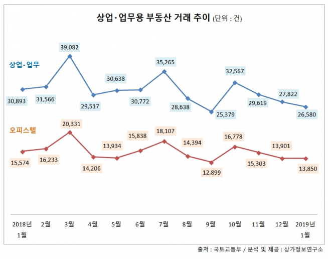 20일 상가정보연구소가 국토교통부 통계를 분석한 결과 지난 1월 상업‧업무용부동산 거래건수는 2만6580건으로 전월(2만7822건) 대비 4.5% 감소했고, 전년 동월(3만893건)에 비해서는 14% 줄었다.