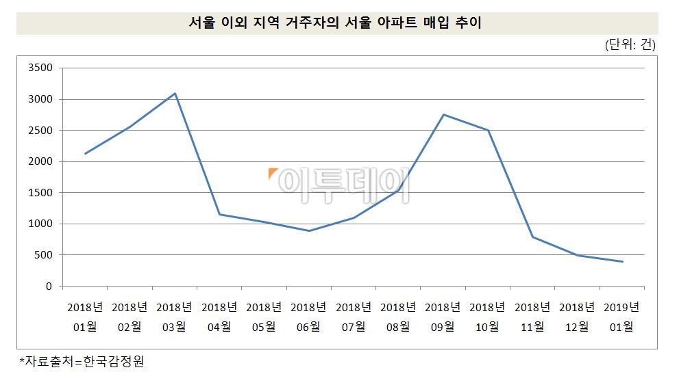 그러다 작년 말 정부 규제가 강화되면서 서울 부동산 시장이 냉각기로 접어들자 지방 거주자들의 매입 속도도 더뎌졌다. 작년 10월 2500건이던 거래가 한 달 뒤에는 787건으로 급감했다. 작년 12월에는 498건으로 더 줄었다.