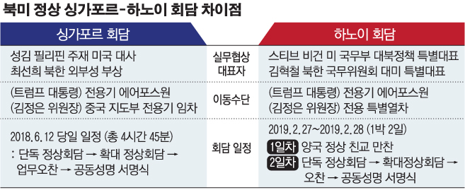 회담의 형식이 달라진 것도 역시 중요한 변화다. 싱가포르 회담이 작년 6월 12일 당일치기로 끝난 반면, 하노이 회담은 27~28일 1박 2일간 이뤄진다. 이번 회담에서 진전된 합의가 예상되는 이유다. 두 정상이 상대적으로 충분한 시간을 갖게 된 만큼 복잡하게 얽혀 있는 핵심 의제를 둘러싸고 보다 허심탄회한 논의를 이어갈 수 있을 것으로 관측된다.