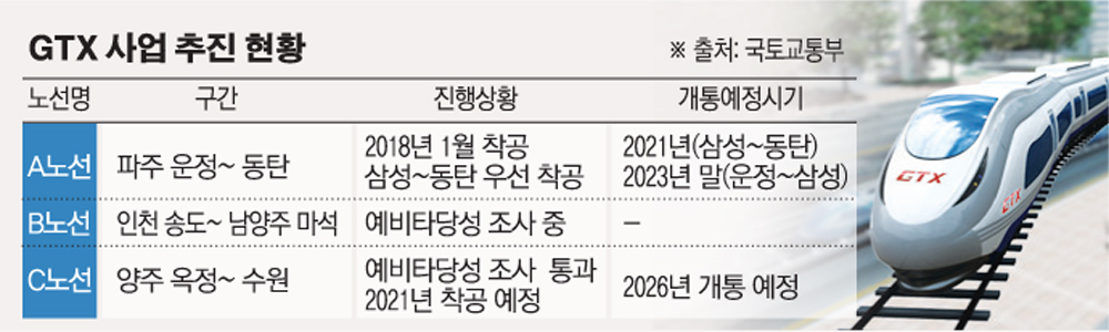 사업진행 속도가 빠른 A노선은 동탄-삼성 구간이 오는 2021년 개통할 예정이며, 이후 파주-삼성 구간이 2023년 말까지 공사를 마무리하고 개통할 예정이다.