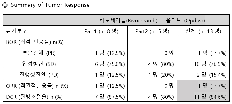이번 임상시험은 리보세라닙과 옵디보간의 병용 임상 효능을 확인한 첫 번째 결과다. 옵디보를 투여받고 있는 환자가 저용량의 리보세라닙을 병용 투여를 받았고, 그 결과 질병이 개선된 것으로 관찰됐다. 또 부작용이 효율적으로 관리될 수 있는 것을 확인했다.