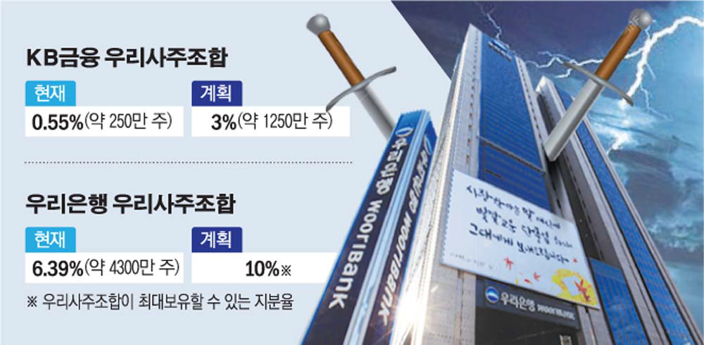국내 은행 중 최대 규모의 우리사주조합 지분율(6.39%)을 가진 우리은행도 지분 늘리기에 나섰다. 우리은행 노조 관계자는 “우리사주조합 지분을 10%까지 늘려 최대 주주로 올라서는 것이 목표”라고 말했다. 기존에도 매월 30만 주씩 사들이고 있지만, 뚜렷하게 지분을 늘리기에는 미흡하다. 이에 우리사주조합은 예금보험공사가 지닌 지분(18.32%)을 일부 가져오는 방식을 고려 중이다. 계획대로라면 우리은행의 우리사주조합은 우리금융의 최대주주로 올라설 가능성도 열린 것이다.