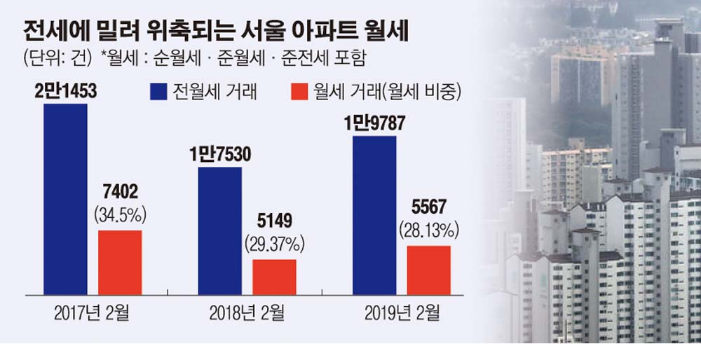 서울 월세 비중은 2015년 3월 처음 30%를 넘어선 뒤 줄곧 30%대를 지켰다. 2017년 3월에는 35.6%까지 치솟았다. 저금리 기조로 집주인들이 전세 대신 월세를 공급해 임대수익을 올렸기 때문이다.