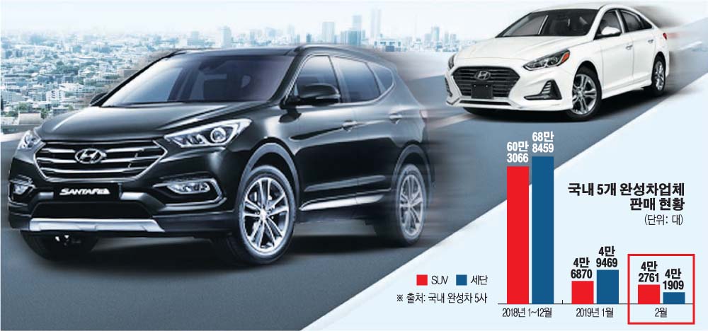 7일 자동차업계에 따르면 국내 5개 완성차 업체의 지난달 SUV 내수 판매량은 4만2761대로 세단 판매량(4만1909대)을 넘어섰다.