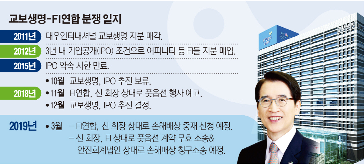 하지만 보험업 침체로 차익 실현이 어려운 상황에서 투자에 나설 곳을 찾기가 만만치 않다. FI 지분 제3자 매각은 방식(SPC를 거치지 않는)만 다를 뿐 첫번째 협상안과 동일하다. 마지막 제안인 IPO 역시 녹록지 않다. FI연합과의 분쟁이 봉합되지 않으면 한국거래소 예비심사 문턱도 넘을 수 없다. 교보생명이 이날 예정된 해외 투자설명회(NDR)를 순연한 것도 같은 맥락이다.