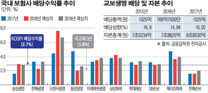 업계 관계자들은 투자자를 끌어모으려면 배당 매력을 어필해야 하는데 쉽지 않다고 말한다. 새 회계기준(IFRS17)을 앞두고 올해 생보업계의 마이너스 성장이 우려되는 상황에서 무리하게 배당 여력을 늘리면 자본 압박을 받을 수 있다는 설명이다. 교보생명 관계자는 “신지급여력제도(K-ICS·킥스) 기준이 완화되고 있어 배당을 줄 재무적 여력은 충분하다”고 말했다.
