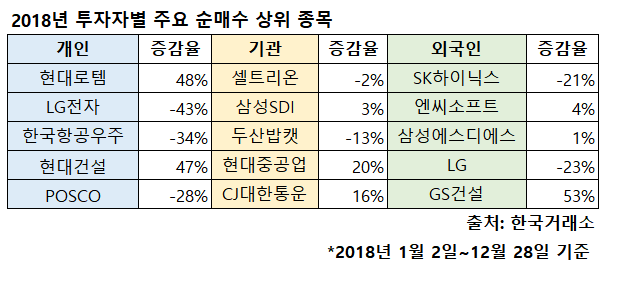 기관과 외국인이 순매수한 종목들은 중복되는 경우가 많았다. 반면 개인과 외국인, 개인과 기관 간 겹치는 종목은 거의 없었다. 개인이 5년간 꾸준히 매수한 상위 종목은 LG디스플레이, 현대차, 삼성전자, 현대건설, 한국항공우주, 대우조선해양 등이다. 기관의 경우 네이버, 카카오, 삼성에스디에스, 엔씨소프트, POSCO 등으로 조사됐다. 외국인은 네이버, 카카오, 삼성에스디에스, 삼성바이오로직스, SK에 대한 매수가 많았다.