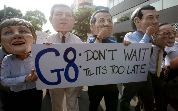 일본 북부 삿포로에서 G8(선진 8개 국) 정상들의 가면을 쓴 5000여명의 시위대가 7~9일 열리는 G8 정상회담에 반대하는 집회를 열고 있다. (뉴시스)