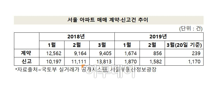 계약 건수가 줄면서 신고 건수도 크게 감소했다. 서울부동산정보광장에서 집계하는 이달 아파트 매매 신고건은 1170건(20일 기준)으로 나타났다. 작년 3월 한 달간 1만 건이 넘는 1만3813건이 신고된 것과 비교하면 대조적이다.