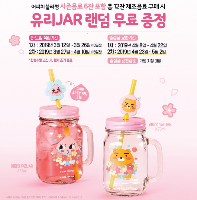 이러한 성원에 힘입어 이디야커피는 카카오프렌즈 컬래버 MD 증정 이벤트 기간을 연장하기로 했다. 해당 이벤트는 컬래버레이션 신제품 2종 6잔을 포함해 총 12잔의 음료를 구매한 고객을 대상으로 카카오프렌즈의 ‘라이언’과 ‘어피치’가 새겨진 유리병(Jar)을 증정하는 내용이며 3월 26일까지였던 적립 기간을 4월 10일까지 연장한다. 연장된 적립 내역은 이디야커피의 멤버십 앱인 ‘이디야멤버스’ 내의 ‘E-드림’ 이벤트 페이지에서 확인 가능하다.