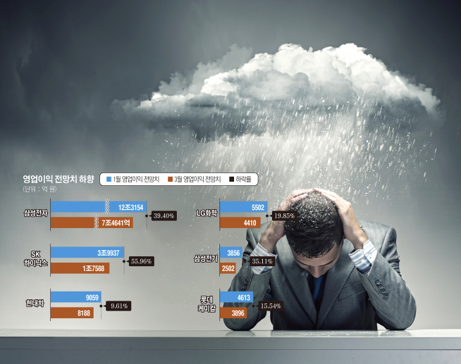 특히 삼성전자의 영업이익 전망치는 12조3154억 원에서 7조4641억 원으로 39.4% 줄었다. 이어 SK하이닉스(3조9937억 원→1조7588억 원), 현대차(9059억 원→8188억 원), LG화학(5502억 원→4410억 원), 삼성전기(3856억 원→2502억 원), 롯데케미칼(4613억 원→3896억 원) 등도 감소했다.