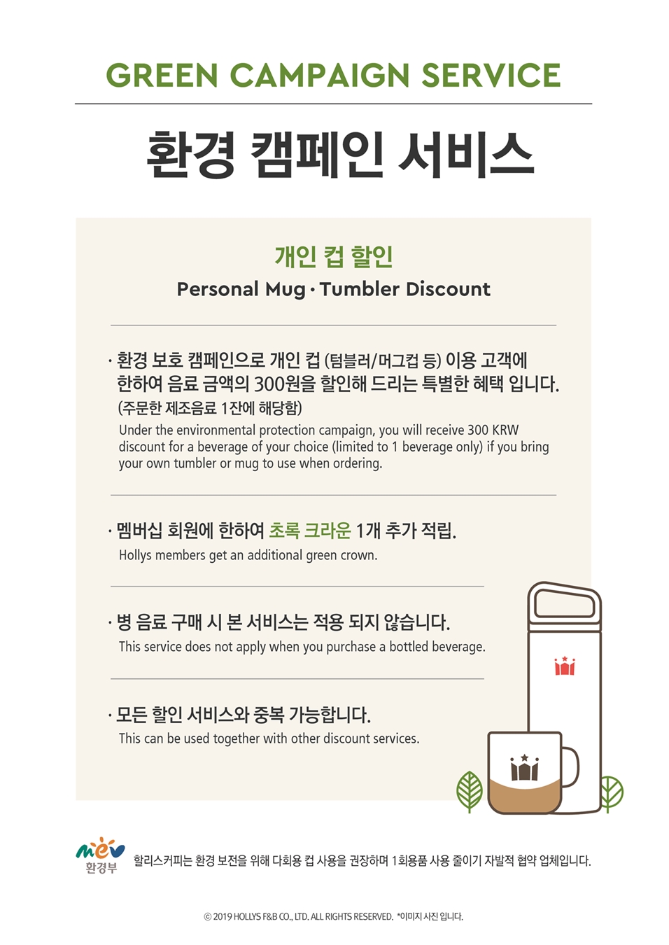 할리스커피는 ‘그린커피라이프’ 실천을 위한 머그, 텀블러 등 개인 컵 사용 권장에 힘쓰고 있다. 이에 매장 내에서 고객들의 개인 컵 사용에 대한 참여를 더욱 도모하고자 할리스커피 크라운 멤버십 회원을 위한 새로운 ‘환경 서비스 혜택’ 제도를 시행한다.