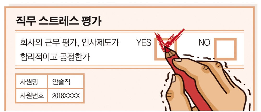 최근 직무 스트레스 평가를 받았다는 대기업 A사의 직원은 “‘회사의 근무 평가, 인사제도가 합리적이고 공정한가’ 같은 질문에 어느 누가 자신의 이름과 사원번호를 적고 진솔하게 답변할 수 있겠나”며 “아무리 회사 담당자가 잘 관리한다고 말하더라도 찜찜해서 속마음 그대로 답변하기 어렵다”고 토로했다.