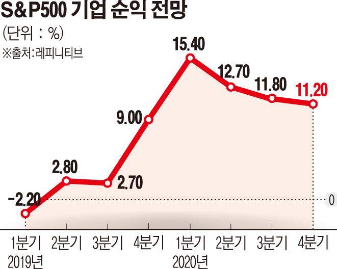 다만 일각에서는 바닥론도 나온다. 1분기 실적 부진은 일시적인 현상이며, 미국 경기가 1분기 이후 반등할 것이란 자신감이 커지면서 기업 실적도 회복될 것이라는 전망이다. 레피니티브에 따르면 2분기 기업 순익은 전년 동기 대비 2.8% 증가하고, 4분기에는 9%가량 늘 것으로 예상됐다.
