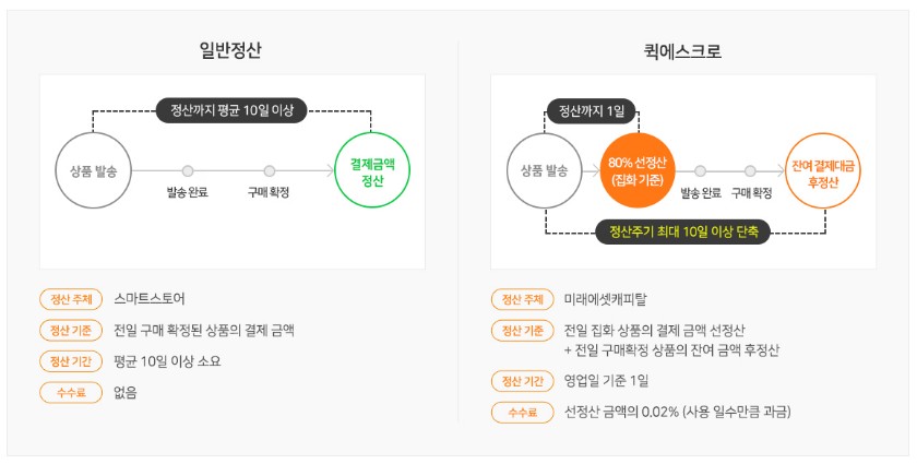 ‘퀵 에스크로’ 프로그램은 미래에셋과 함께 선보이는 것으로 사업 확장 가능성이 높은 일정 수준 이상의 스마트스토어 판매자를 대상으로 진행된다. 기존 프로세스와 다르게 상품을 발송하면 다음날 판매대금의 80%를 바로 지급받을 수 있도록 해 정산 주기를 10일 이상 단축시킨 것이 특징이다. 이에 상품을 팔고도 당장 현금 확보가 어려워 투자 확장을 하지 못하거나, 운영자금이 필요함에도 대출을 받지 못하는 판매자들에게 큰 도움이 될 것으로 기대하고 있다.