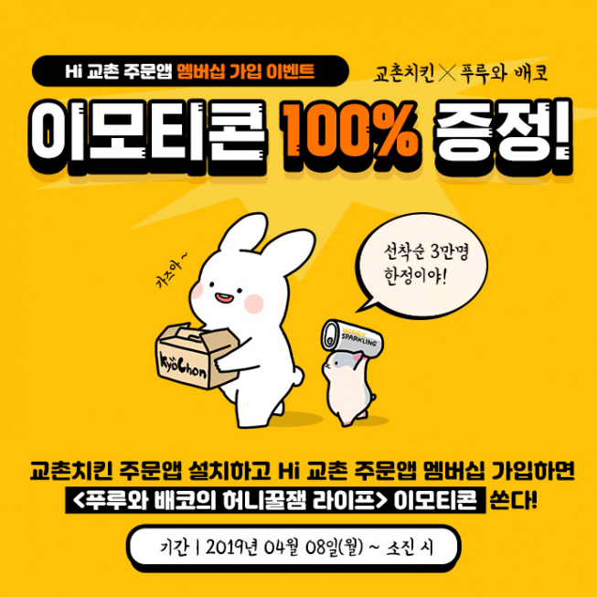이번 론칭 이벤트를 위해 교촌치킨은 인기 이모티콘 캐릭터인 ‘푸루와 배코’와 제휴를 진행했다. 교촌치킨과 관련된 다양한 소재를 이용해 제작한 이모티콘으로 교촌치킨 주문앱을 설치하고, 주문앱 멤버십을 가입한 고객 3만명에게 선착순 무료로 증정된다.